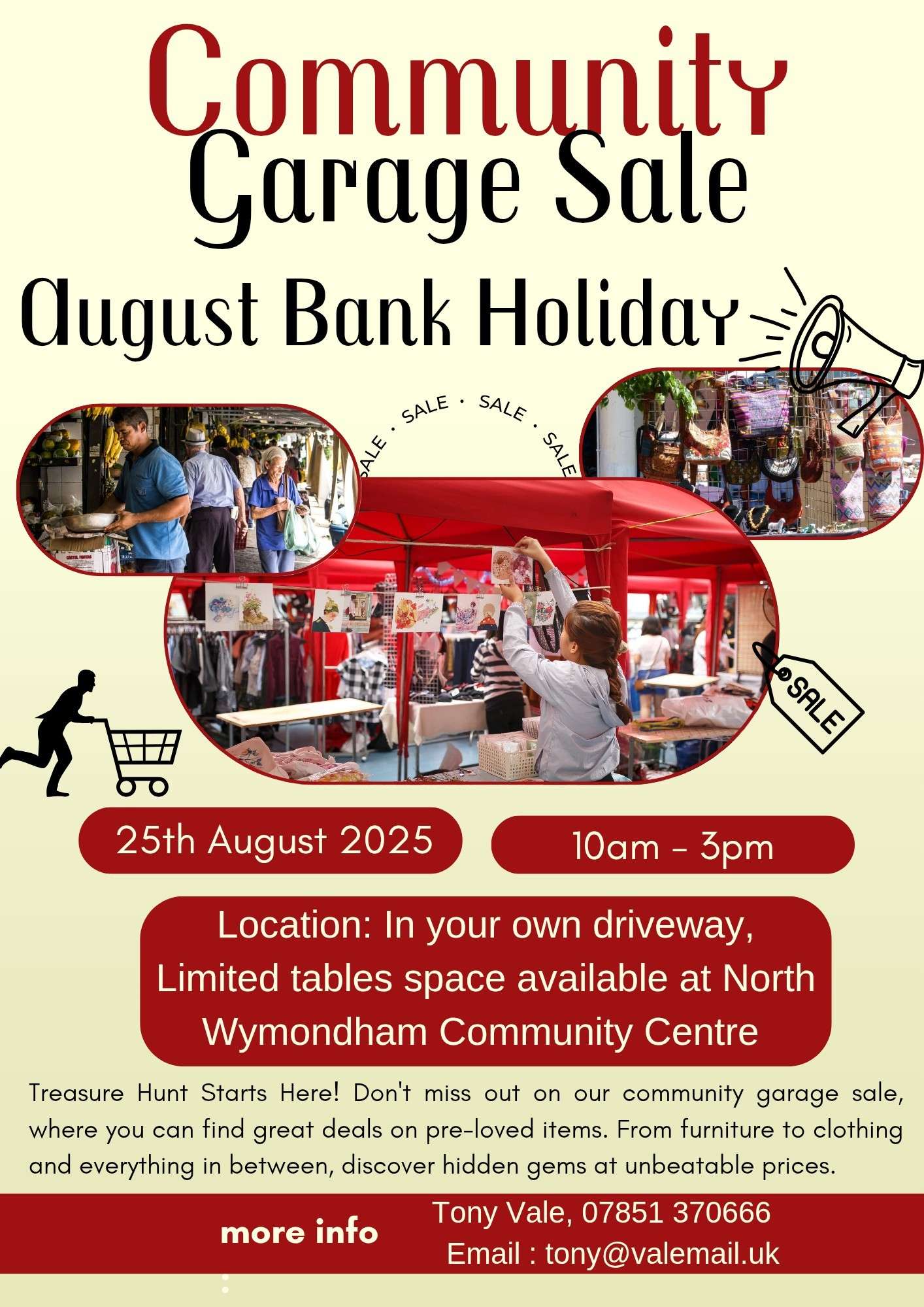 Travel around the streets of Wymondham to explore a range of pre-loved items including furniture, clothing, toys and more! The full list of locations (approx. 70 households) will be shared on Sunday via North Wymondham Community Centre.