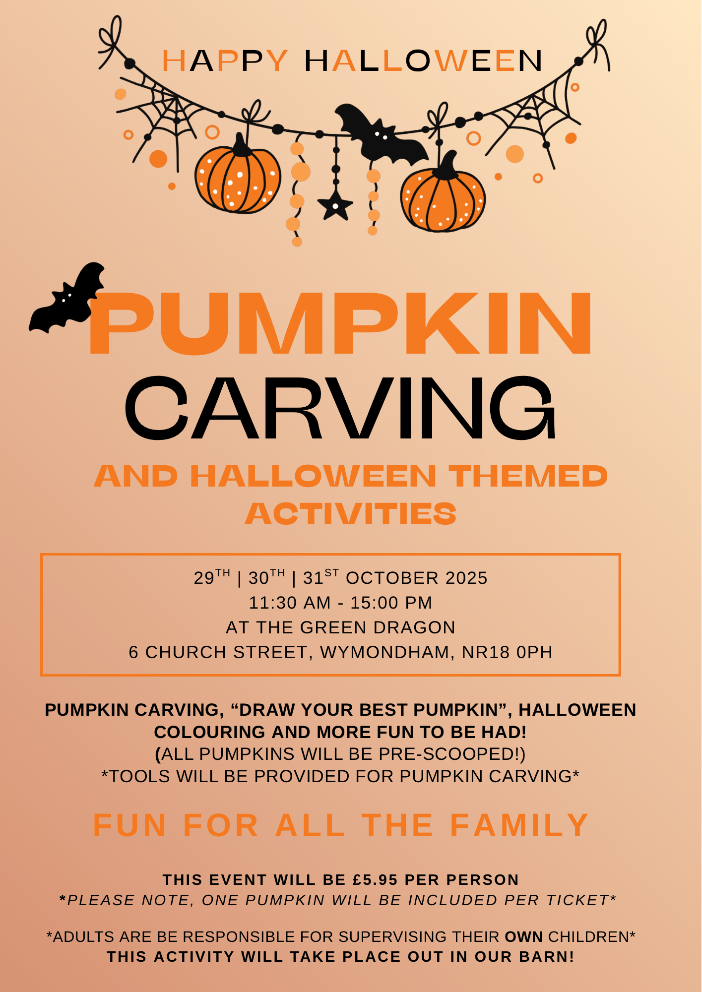 Come on down to The Green Dragon! We will be turning our outside barn into a fun, autumnal safe space for families to come and enjoy!