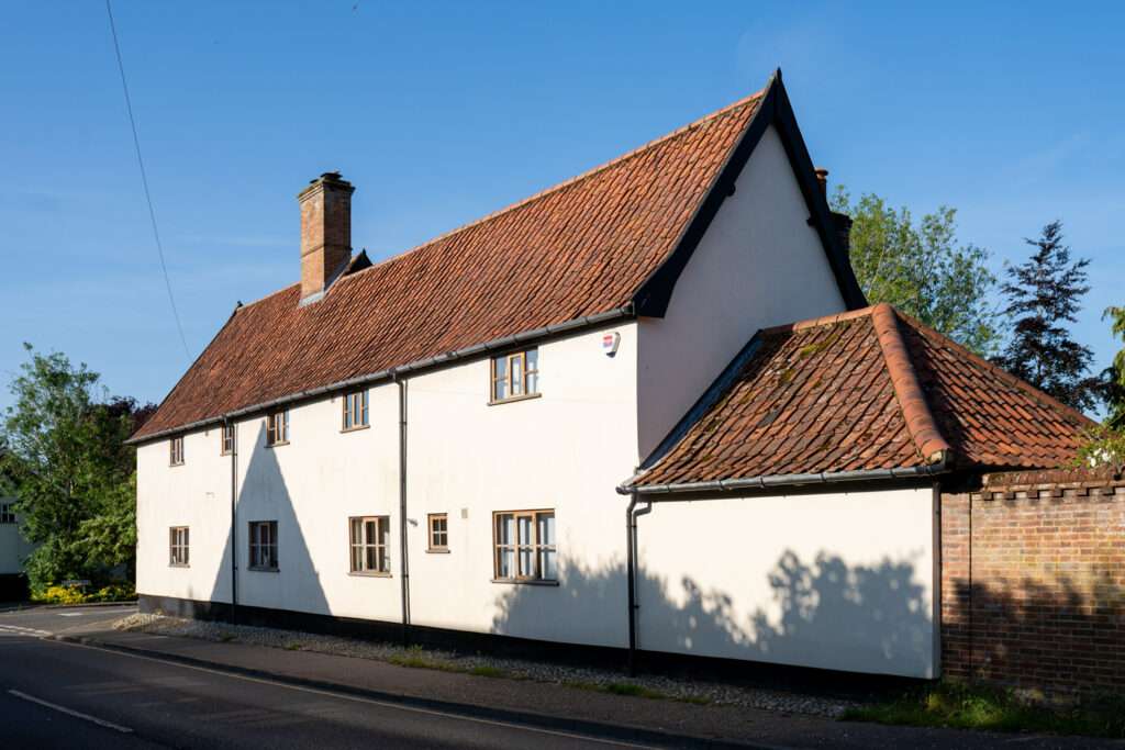 Just into Town Green on the left is a building now containing the Sports Bar. This was the original Public Hall built in 1888. Used for meetings & entertainments, it became the first town cinema. On the right is the Methodist Church 1870, gault brick with red brick dressings. Roof not visible, but probably slate. 2 storeys externally. Facade is composition of 2 gables, the steeper one to centre, broken-forward, bay in front of other. Horizontal rustication to lower stages of facade and returns. The site previously occupied by a bombazine factory and even earlier by the town’s workhouse. Bombazine is a type of weighty corded fabric, often used for Victorian era funeral clothes.