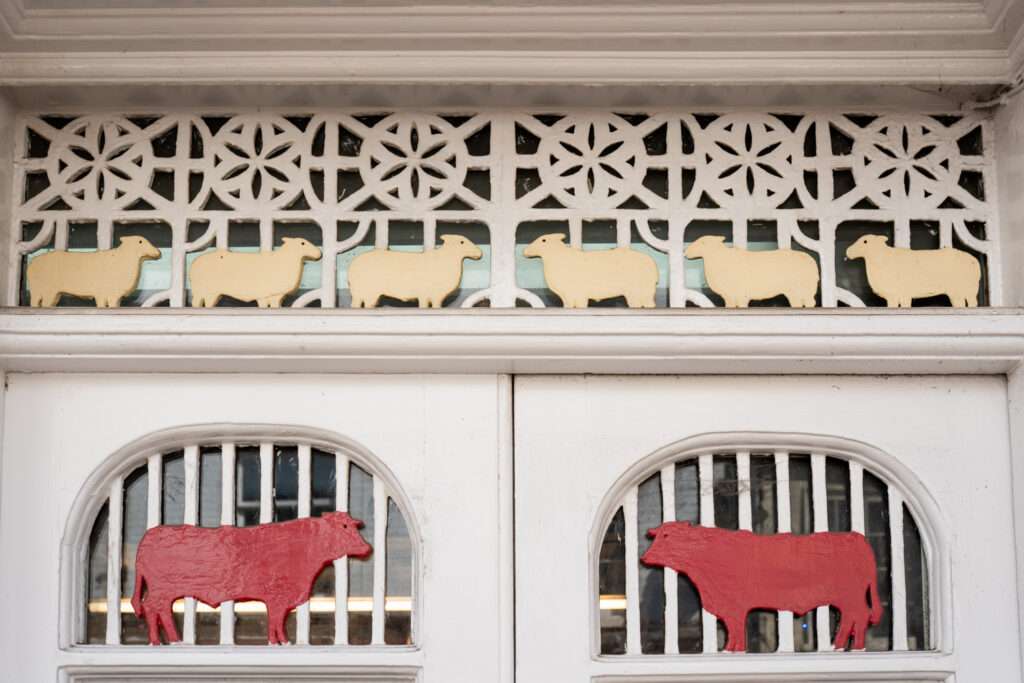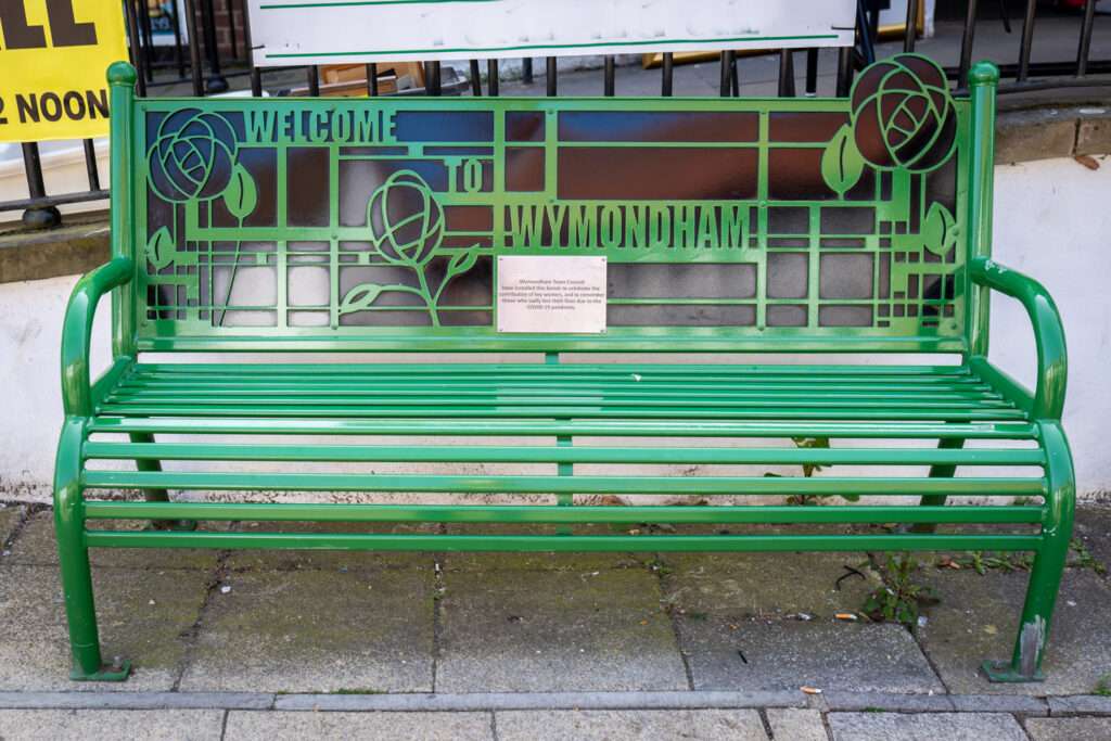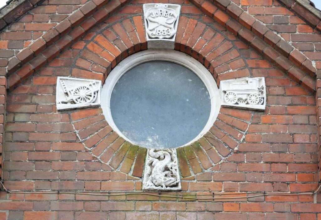 Opposite, the Fire Station, built in 1883 serves today as the entrance to Market Street car park. The carved stones above the arched entrance indicate its former use. The keystone above the circular window shows a knife and spoon. To the left is a wagon and to the right a fire engine, with a salamander beneath. Above the two windows are keystones showing hoses, and at the bottom two firemen in their high helmets frame axes.