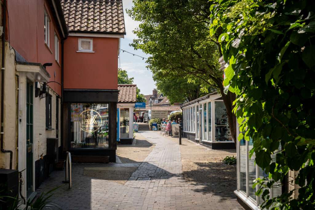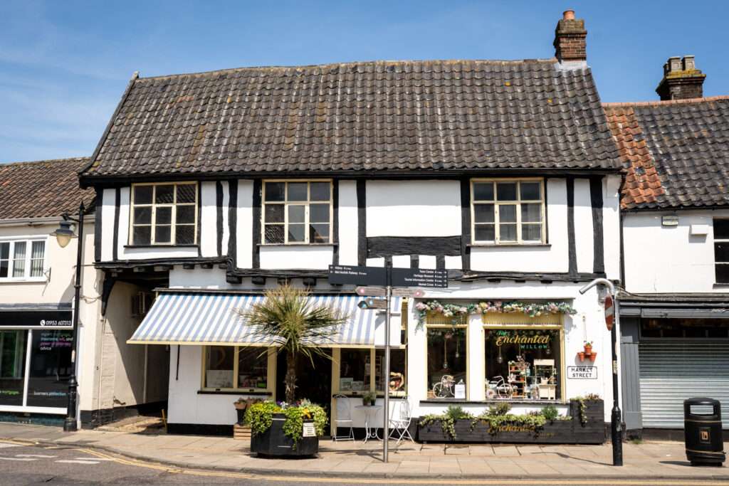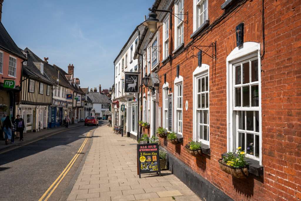 As the main artery of the town it contains two former coaching inns, the Griffin, now shops, and the White Hart. Both were visited in the 19th century by coaches running between London and Norwich. The early Georgian facade of the White Hart conceals the timber-framed inn of the early 17th century.